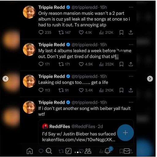 Teens share these tracks online, especially through social media, which makes fans feel like they are part of a smaller exclusive group. The screenshot below of rapper Trippe Redd’s posts show how frustrated artists can get when their music leaks early online. Even though it creates hype, it also proves how much power fans and online communities have in shaping rap culture.